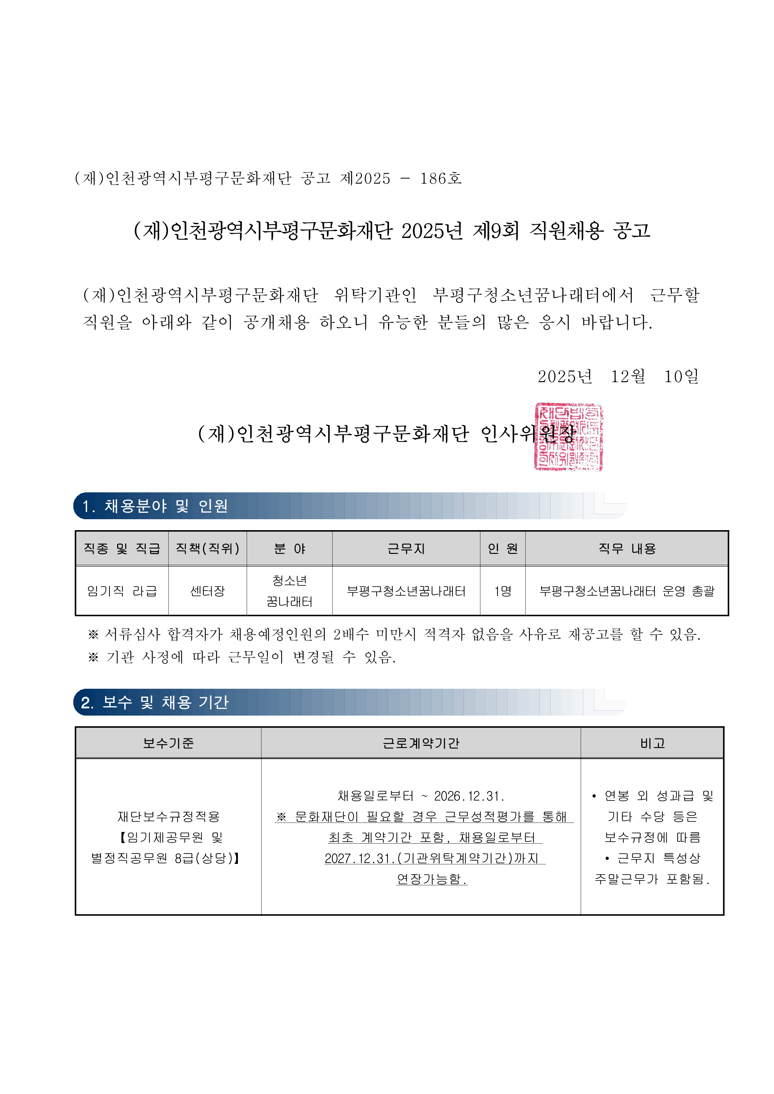 (재)인천광역시부평구문화재단 2025년 제9회 직원 채용 안내