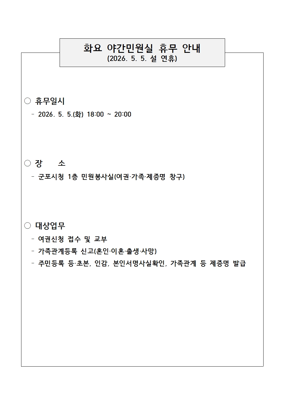 군포시청 민원봉사실「화요 야간민원실」휴무 안내