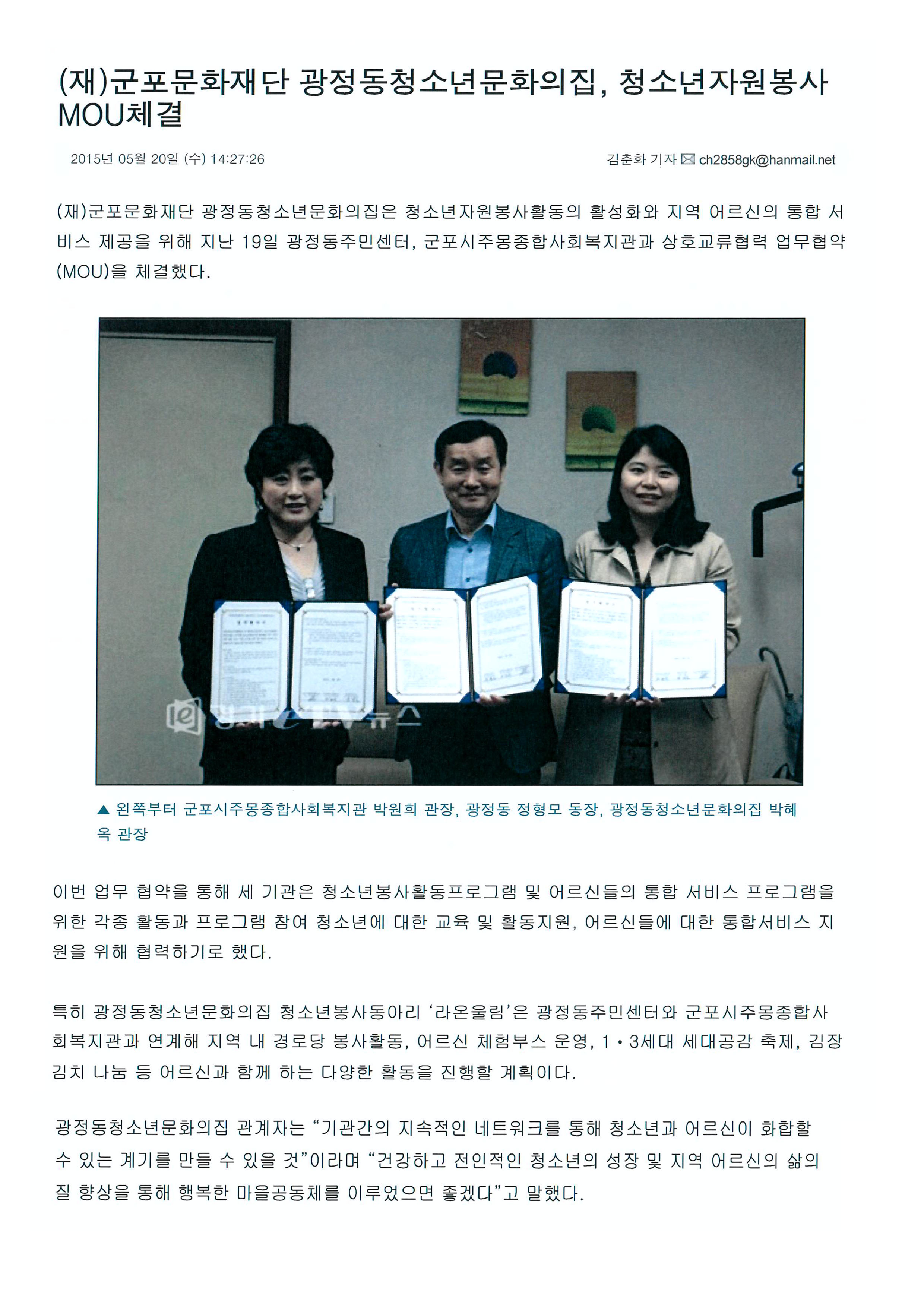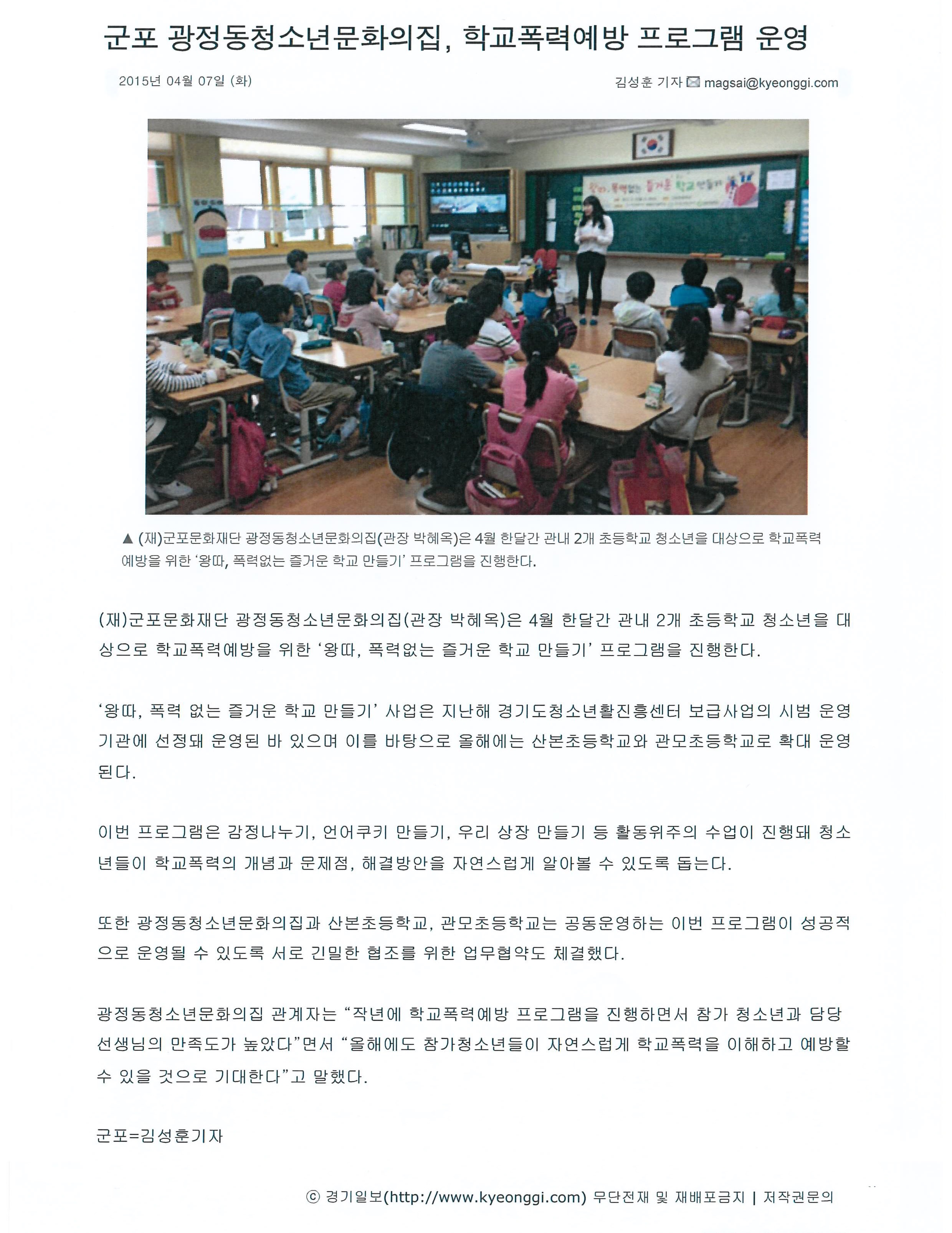 광정동청소년문화의집(관장 박혜옥)은 오는 4월부터 11월까지 군포시 관내 중·고등학생을 대상으로 청소년미래시민참여학교를 운영한다.청소년미래시민참여학교는 더불어 살아가는 미래사회에 청소년이 주인공이 되어 함께 배우고 성장하는 미래시민을 목표로, 미래시민으로 살아가기 위한 다양한 주제를 함께 학습하고 체험하며 나누는 활동으로, 상반기는 인권과 다문화를, 하반기는 환경과 바른먹거리로 구성되어있다.청소년미래시민참여학교는 오는 4월 11일 부터 7월 11일까지 상반기 활동 8회기를 진행하며, 모든 프로그램을 수료하면 봉사활동확인서와 수료증이 제공된다.↑ 우리가 미래시민!!! 광정동청소년문화의집, 청소년미래시민참여학교 운영광정동청소년문화의집은 "청소년의 건강한 성장과 올바른 세계시민의식 함양을 위해 다양한 주제로 프로그램을 진행 할 계획이며 많은 참여와 관심을 부탁드린다."라고 밝혔다.참가를 희망하는 청소년은 광정동청소년문화의집 홈페이지(http://www.gjycc21.or.kr)에서 신청서를 다운받아 이메일(gjycc21@hanmail.net), 팩스(031-398-7935), 또는 현장방문 접수하면 된다. 선착순 20명 모집이며, 활동비는 무료다. 기타 관련 문의는 광정동청소년문화의집(031-390-1480)으로 바란다.