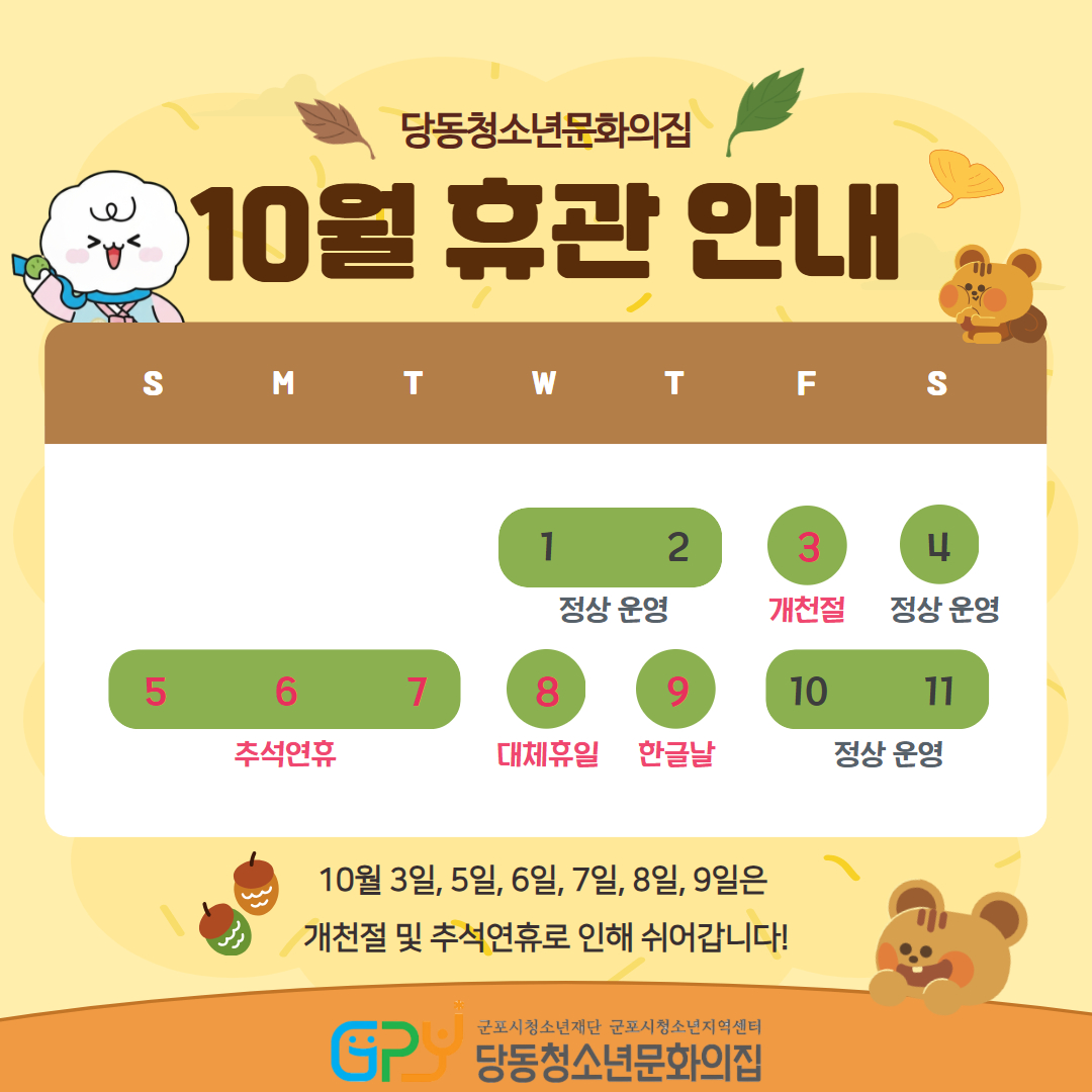 당동청소년문화의집 10월 휴관 안내
