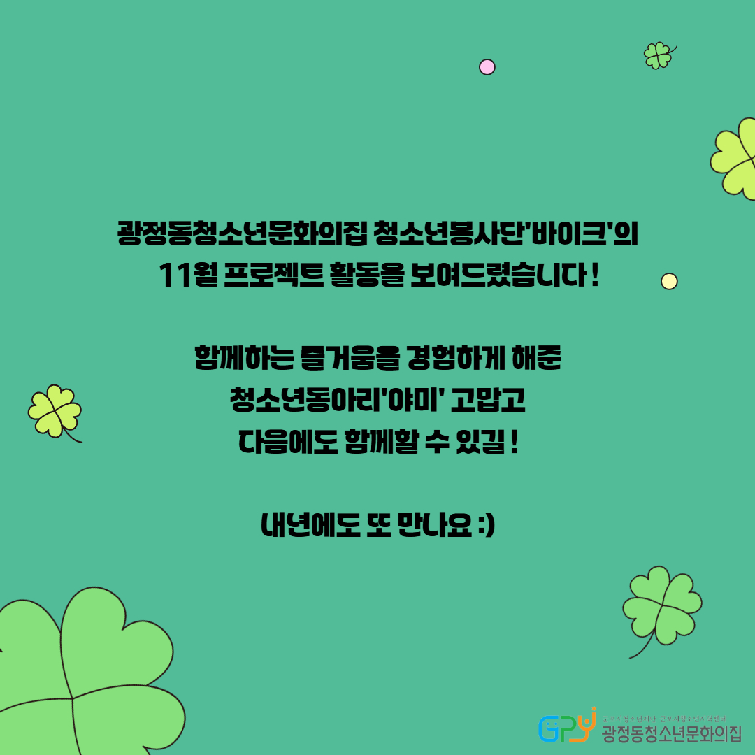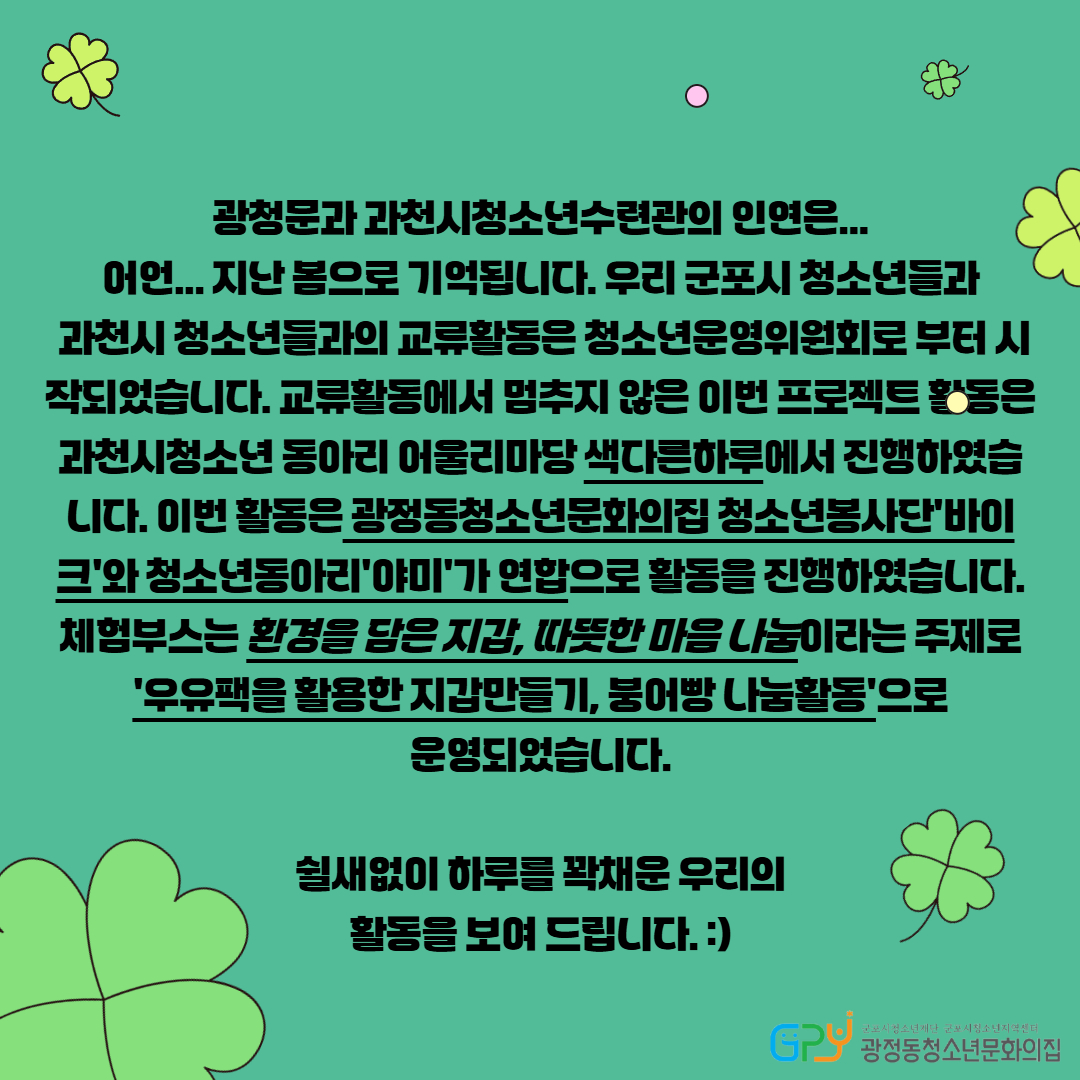 [카드뉴스] 광정동청소년문화으의집 청소년봉사단 '바이크' & 청소년 동아리 '야미' 연합 프로젝트/교류활동