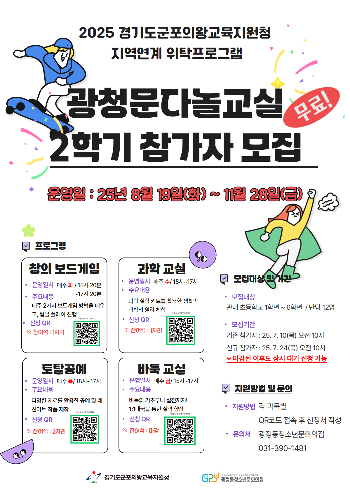 ![]() 안녕하세요 [광청문 다놀교실 ] 2학기 참여자를 모집 합니다. 현재 1학기 참가자 중 기존 참가를 확인 후 잔여석에 한하여 2학기 모집 할 예정입니다. 각 과목별 잔여석을 확인하시고, 신청 바랍니다. 마감 완료 후에도 상시 대기를 받고 있습니다. 월별 출석율 및 중도 해지등의 사유로 취소 인원이 발생 할 경우 대기 순번 대로 연락을 드리오니, 상시 대기 신청도 적극 활용해 주시기 바랍니다. 문의 : 390-1481 |