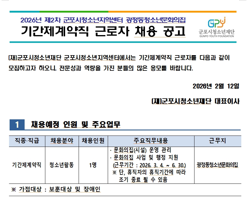 2026년 제2차 군포시청소년지역센터 광정동청소년문화의집 기간제계약직 근로자 채용 공고