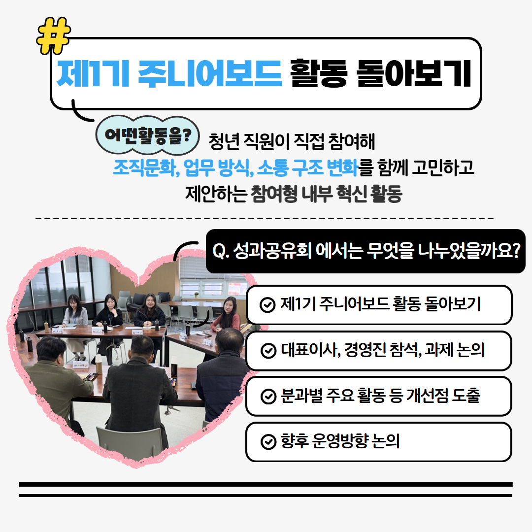 ![]() ![]() ![]() ![]() 군포시청소년재단은 지난 2026. 1. 22.(목), 「제1기 주니어보드 해단식 및 성과공유회」를 개최했습니다. 이번 성과공유회에는 제1기 주니어보드 위원 8명과 대표이사 및 경영진 등이 참석하여, 주니어보드의 활동 성과를 공유하고 참여 경험과 향후 운영 개선 과제에 대해 의견을 나누었습니다. 재단은 청년 직원의 참여를 기반으로 조직 내 소통을 강화하고 운영 개선을 도모하기 위해 주니어보드를 운영해 왔으며, 금번 행사는 그간의 추진 결과를 점검하고 향후 발전 방향을 모색하는 자리로 마련되었습니다. 군포시청소년재단은 앞으로도 내부 구성원의 참여 기반을 확대하고, 제안된 의견을 운영에 반영하여 조직문화 개선 및 소통 체계 고도화를 추진해 나가겠습니다. 감사합니다. |