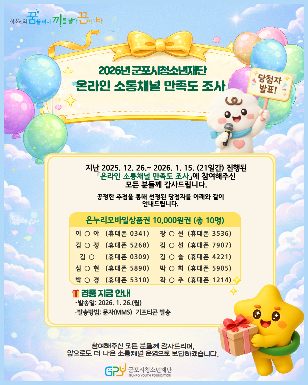 ![]() ♥ 당첨을 진심으로 축하드립니다 ♥ 우선, 저희 'SNS 만족도 설문조사'이벤트에 관심을 가지고 참여해주신 모든 분들께 깊이 감사드립니다. 여러분의 소중한 의견은 군포시청소년재단이 더 나은 소통 채널로 발전해나가는 데 귀중한 밑거름이 되었습니다 :) 앞으로도 청소년과 시민 여러분의 의견을 적극 반영하여, 더욱 신뢰받는 소통 환경을 조성할 수 있도록 최선을 다하겠습니다. 당첨되신 분들께 다시 한 번 진심으로 축하의 말씀을 전합니다! ♥ 당첨자 확인 ♥ - 첨부된 포스터 이미지를 참고해 주세요. ♥ 경품 지급 안내 ♥ - 발송 일자: 2026. 1. 26.(월) - 발송 방법: 문자(MMS) 기프티콘 발송 ♥ 이벤트 상품 ♥ - 온누리모바일상품권 10,000원권(총 10명) ♥ 유의사항 ♥ - 개인정보 보호를 위해 성명 일부와 휴대전화 뒷자리만 공개됩니다. - 경품은 발송일 이후 순차적으로 지급되며, 유효기간 내 사용 부탁드립니다. |