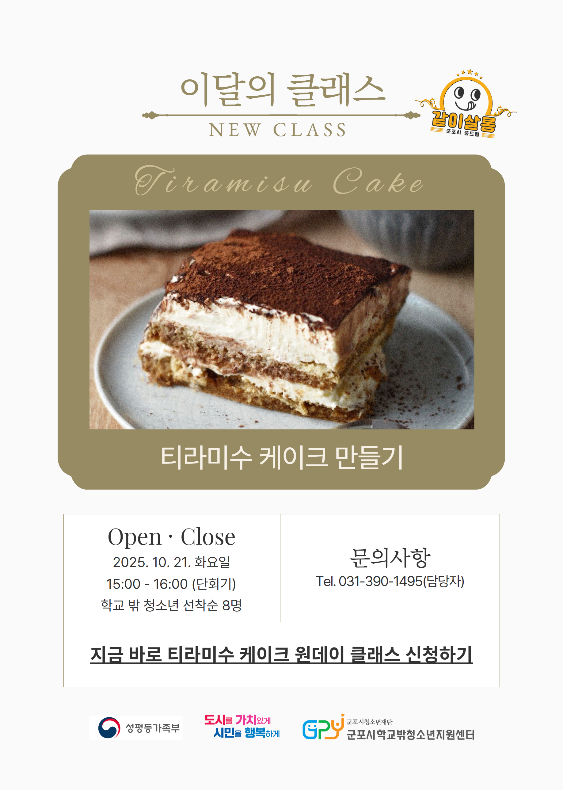 |   '티라미수 만들기' 원데이 클래스 참여자 모집 제과·제빵 동아리에 함께하고 싶었지만 아쉽게 참여하지 못했던 친구들을 위해 특별히 준비했어요! - 일시 : 10월 21일(화) 15:00~16:00, 단회기 - 대상 : 만 9세 ~ 만 24세 청소년 8명 - 장소 : 군포시학교밖청소년지원센터 내부 - 신청 방법 : 담당선생님께 1:1 카카오톡으로 신청 - 문의: 031-390-1495(담당자) |