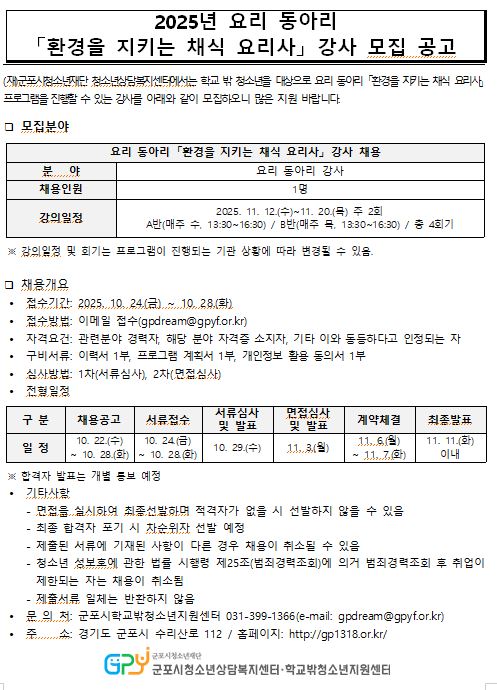붙임1. 공고문 1부.pdf 붙임2. 강사지원서류 양식.hwp 붙임1. 요리 동아리(환경을 지키는 채식 요리사) 강사 모집공고 1부.pdf