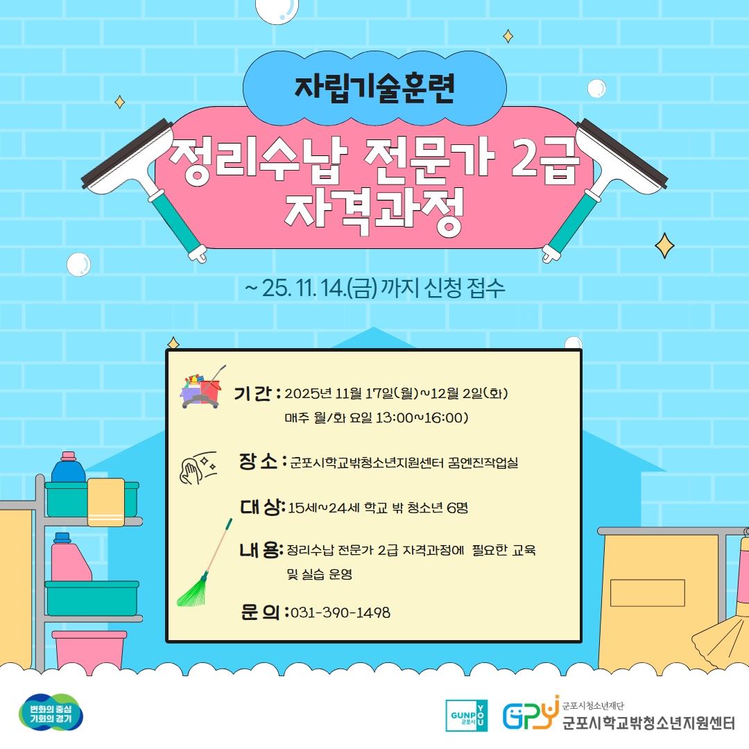 정리수납 전문가로 가는 첫걸음, 지금 시작하세요! "정리만 잘 해도 인생이 달라진다!" 내 방, 내 삶, 내 미래까지 정리하는 시간! [정리수납 2급 자격과정] 군포시 꿈드림에서 진행됩니다! ☞ 대상: 15세~24세 학교 밖 청소년 ☞ 일정: 11.17.~12.2.(월/화 13시~16시) ☞ 장소: 군포시학교밖청소년지원센터 ※ 90%이상 참여시 정리수납 2급 자격증 발급 ☎ 문의: 031-390-1498 지금 바로 도전하세요! |