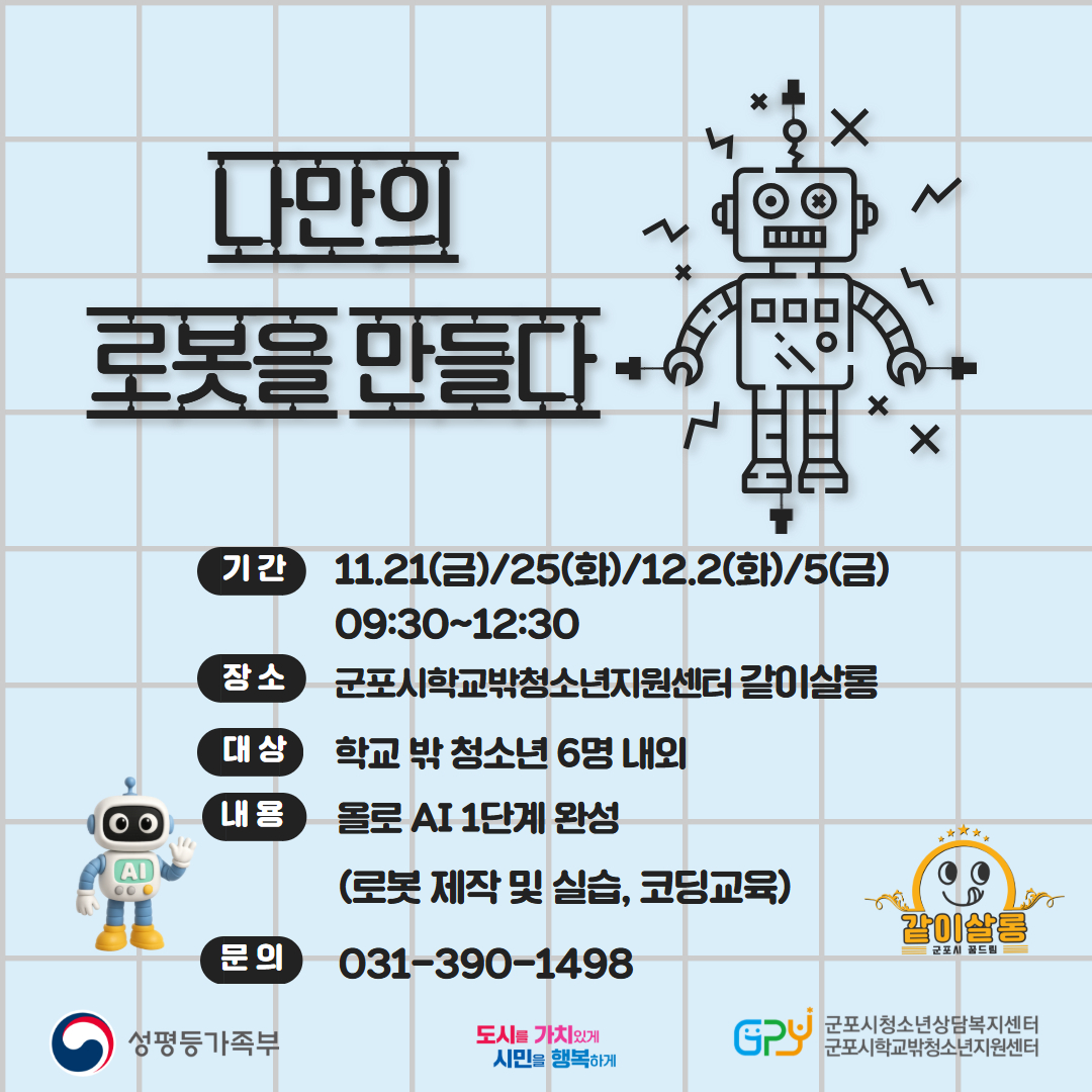 2025년 '같이살롱' 로봇과학체험 [나만의 로봇을 만들다] 참여 청소년을 모집합니다! "미래를 여는 로봇과 AI체험! 우리 친구들이 직접 만드는 첫걸음" 자신만의 로봇을 직접 조립하고, 제어하고, 발표까지! "내가 만들었어!" 라는 뿌듯함 + "와, 움직인다!" 라는 신나는 체험까지 체험 + 실습 중심으로 구성되어, "보고 듣기" 위주가 아닌 "만들고 움직여보기"를 통해 배움을 체감할 수 있게 설계했습니다. * 총 4회, 회당 3시간으로 올로AI 1단계 완성 과정 지금 바로 신청하세요! 문의: 031) 390-1498