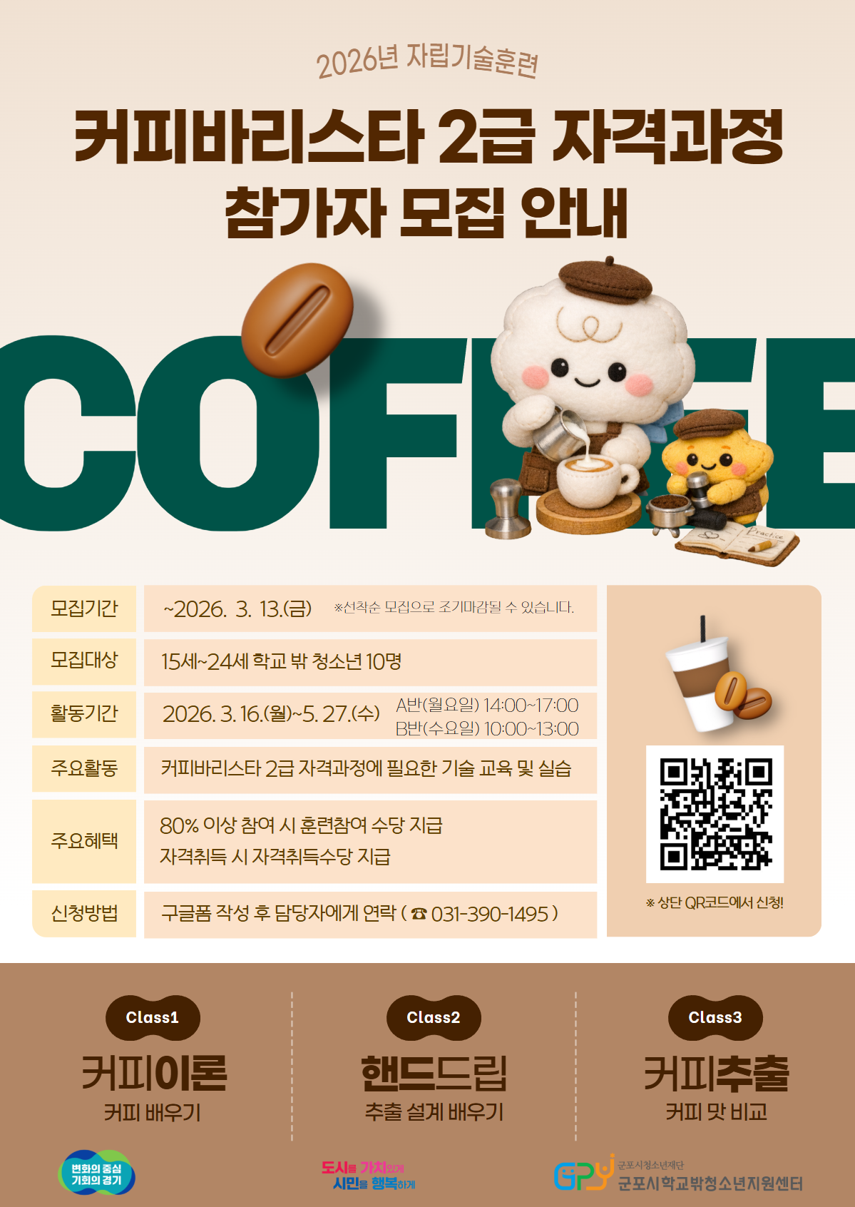 【커피바리스타 2급 자격과정 프로그램 참가자 모집】 안녕하세요. 군포꿈드림 친구들! 기다리고 기다리던 "커피바리스타 2급" 참가자를 모집합니다! 3/16(월) ~ 5/27(수) 주 2회 매주 월·수요일에 진행되며, 장소는 센터(꿈엔진 작업실)에서 진행될 예정입니다. ★A반 월 14:00~17:00 / 수 10:00~13:00 "만 15세~ 만 24세 학교 밖 청소년"은 참여가능하며, 모집은 선착순에 따라 마감될 수 있습니다. ★자세한 사항은 포스터 및 세부 일정표를 참고해주세요:) |