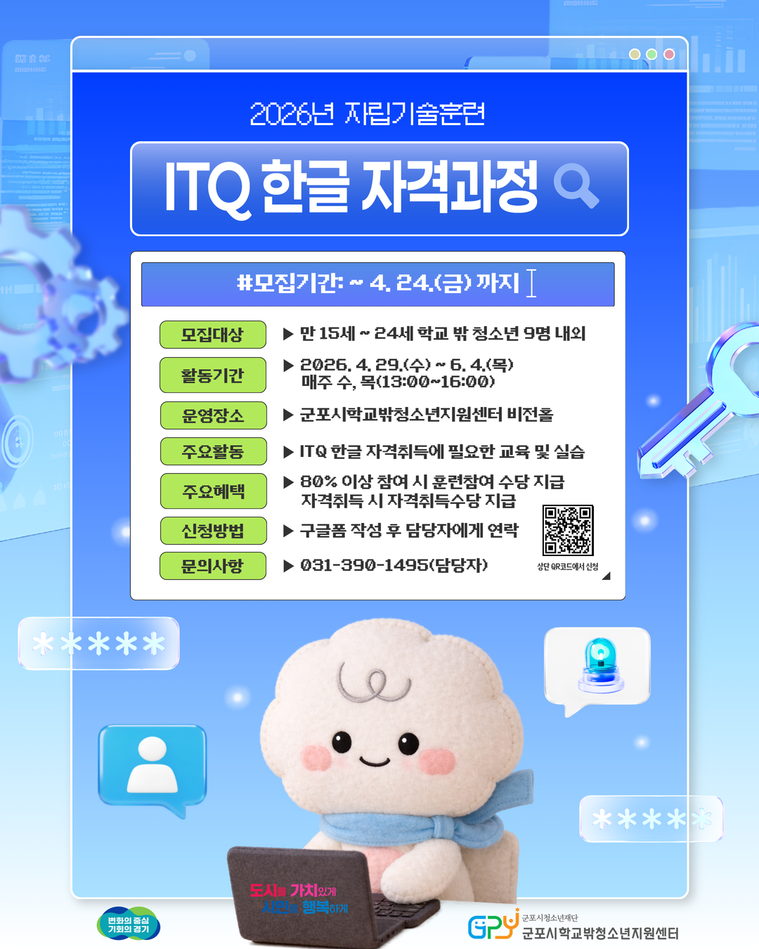 【ITQ 한글 자격과정 프로그램 참가자 모집】 안녕하세요. 군포꿈드림 친구들! 기다리고 기다리던 "ITQ 한글 자격과정" 참가자를 모집합니다! ITQ 자격증은 사무·행정 분야로의 진출에 도움이 되는 실무 중심 자격증입니다. 4/29(수) ~ 6/4(목) 주 2회 매주 수·목요일(13:00~16:00)에 진행되며, 장소는 센터(군포꿈드림) 비전홀에서 진행될 예정입니다. 자세한 내용은 위에 이미지를 참고해주세요. |