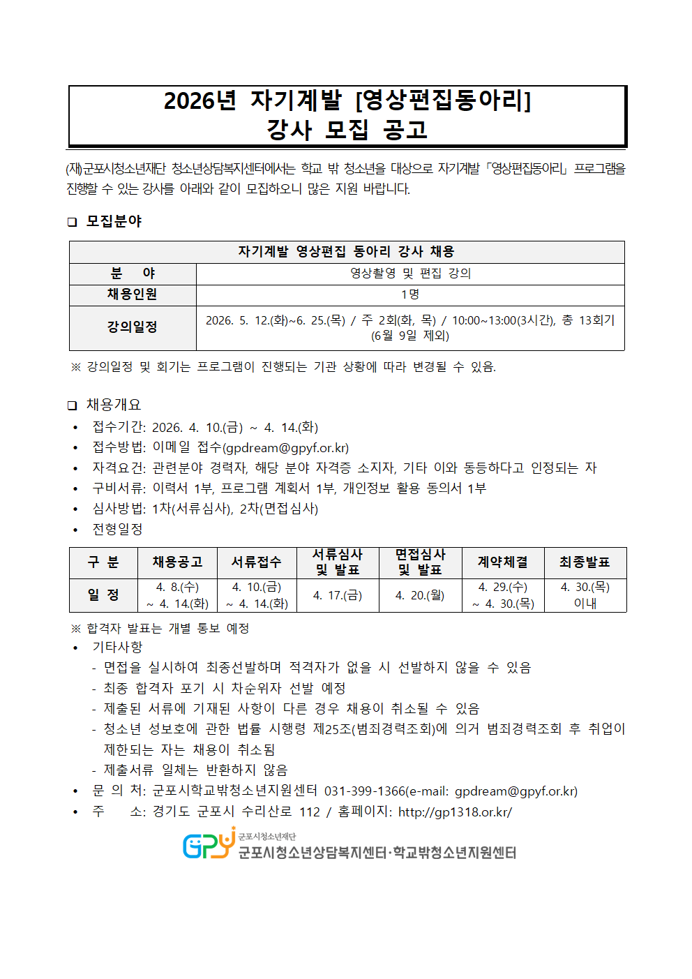 [꿈드림] 2026년 자기계발「영상편집동아리」 강사 모집 공고