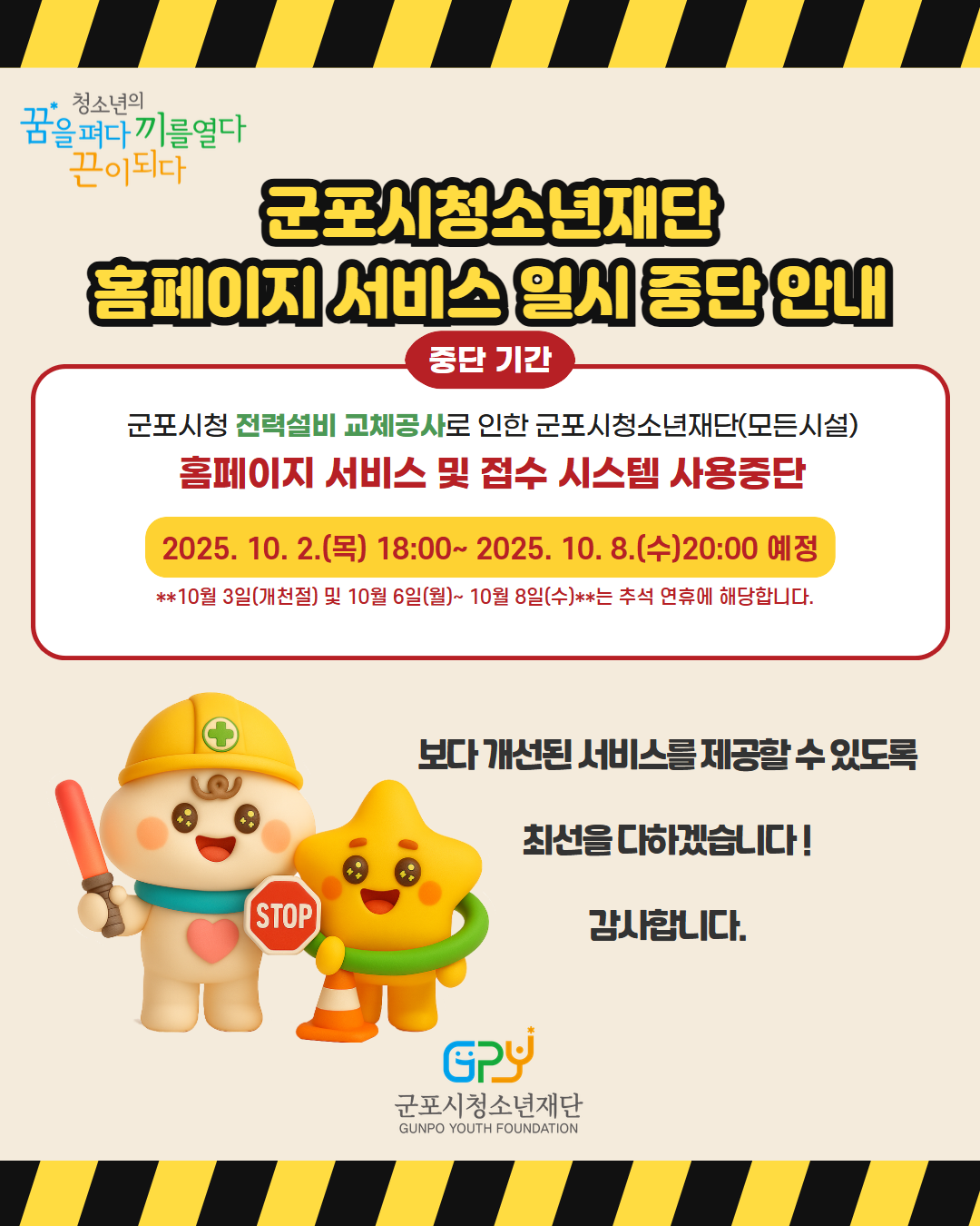 [공지]군포시청소년재단 홈페이지 서비스 및 접수 시스템 사용중단 안내