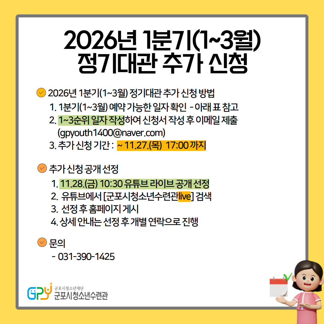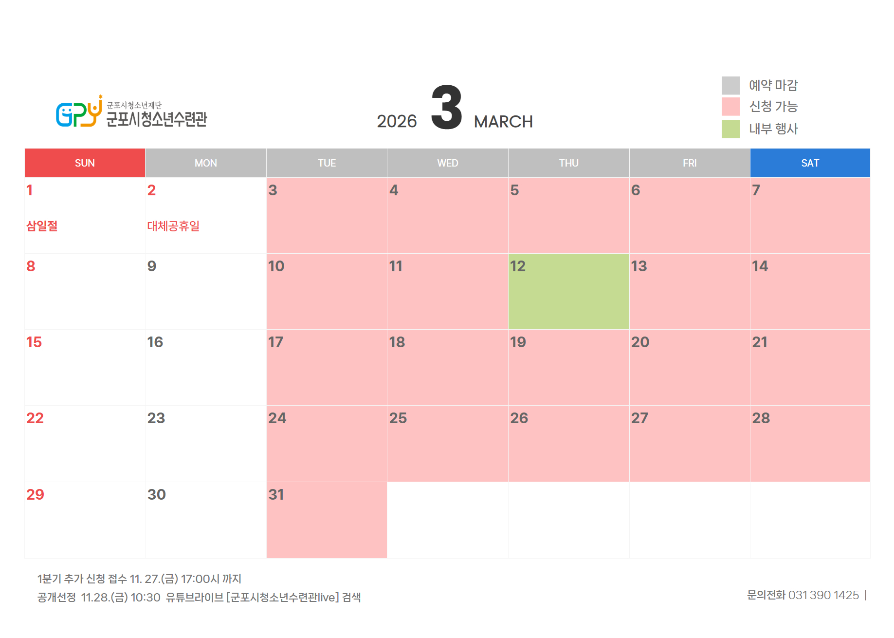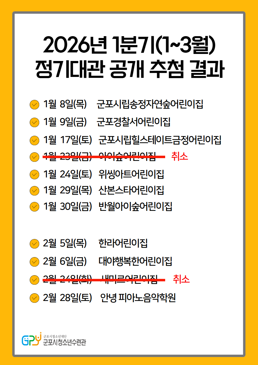 청소년어울림극장 사용 신청서(2026년).hwp 어울림극장_정기 대관 1차 선정 결과 (11.27).jpg 1분기 정기대관 추가 신청 안내.jpg 대관 신청 가능 일정(11.26.).jpg 대관 신청 가능 일정(2월) - 11.27.jpg 대관 신청 가능 일정 (3월).jpg