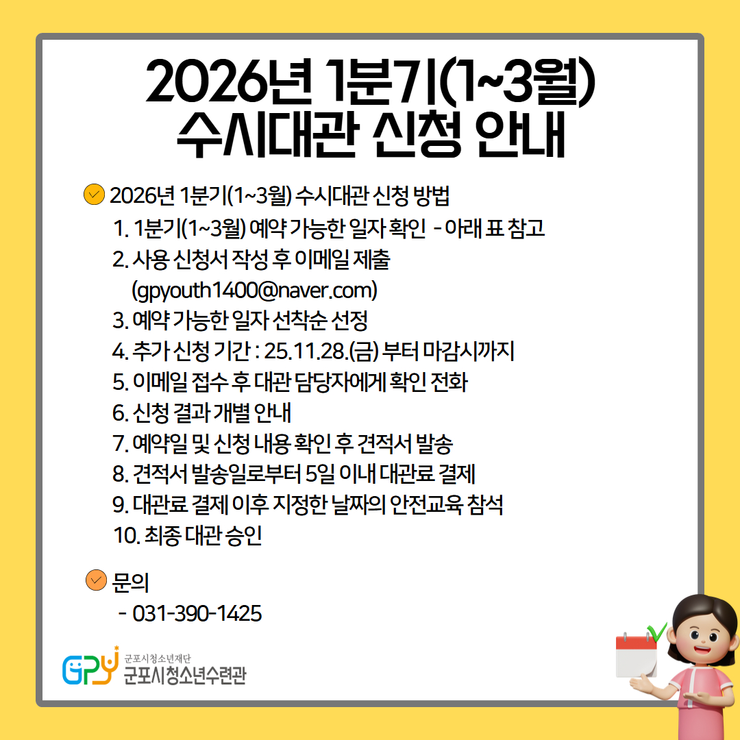 청소년어울림극장 사용 신청서(2026년).hwp 어울림극장_정기 대관 중지 안내문.jpg 어울림극장_1분기 수시 대관 안내문.jpg 1210 대관 신청 가능 일정 1.jpg 1210 대관 신청 가능 일정 2.jpg 1210 대관 신청 가능 일정 3.jpg
