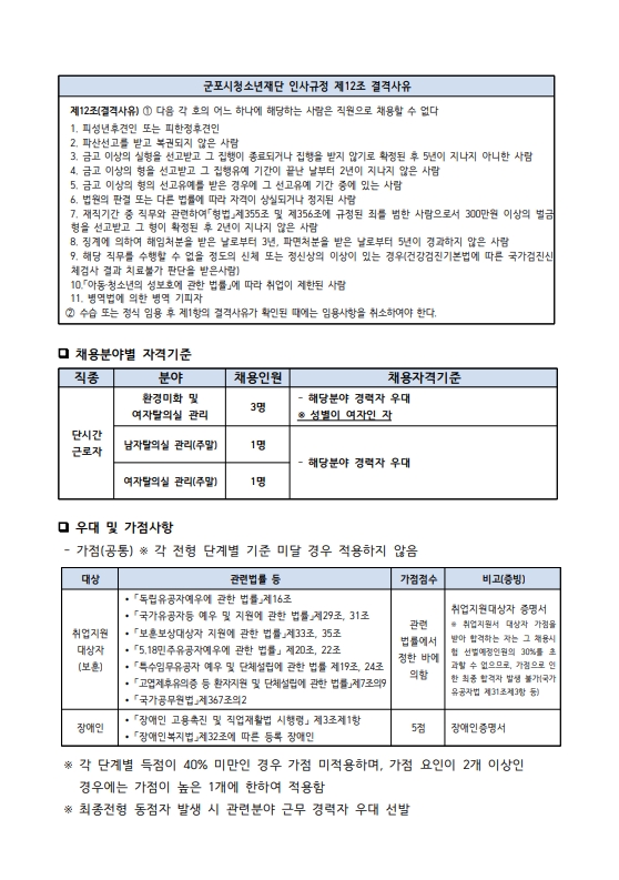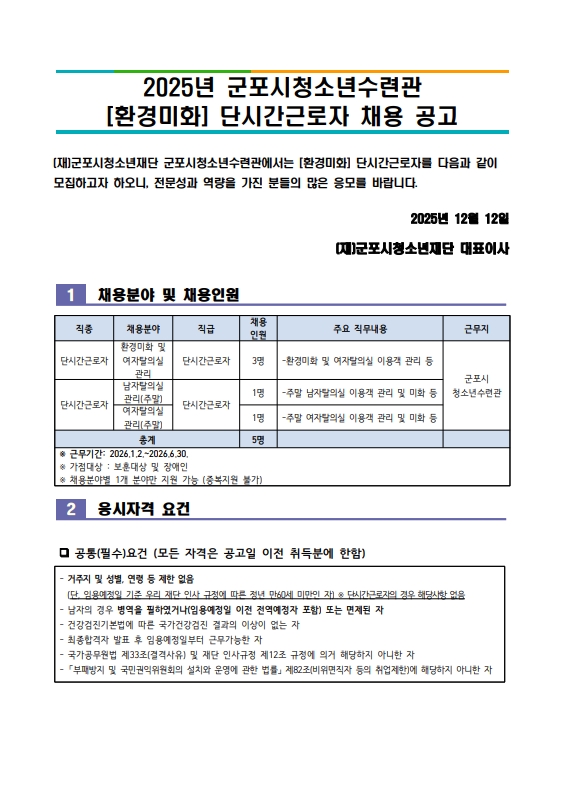 (채용) 군포시청소년수련관 환경미화 단시간근로자 채용 공고문