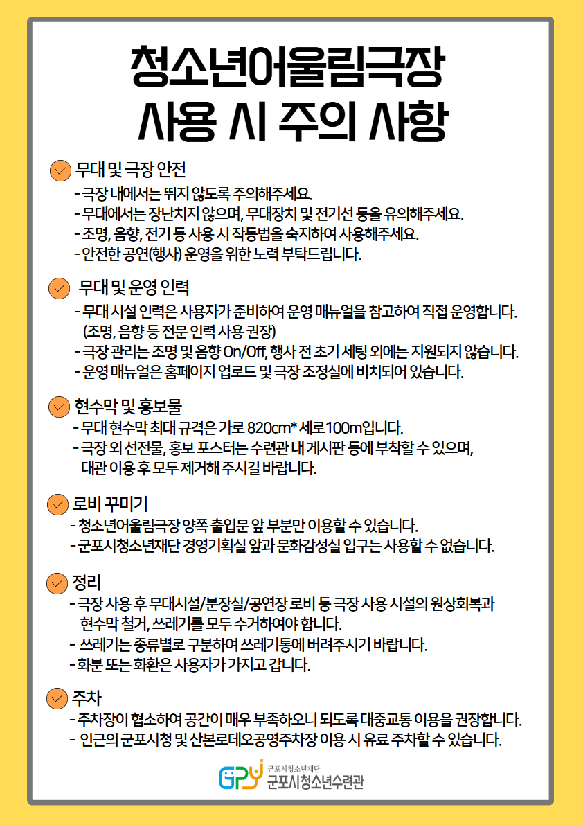 어울림극장_정기 대관 안내문.jpg 어울림극장 사용 주의사항1.jpg 어울림극장 사용 주의사항2.jpg 어울림극장 배치도.jpg (1227)청소년 극장 메뉴얼.pdf