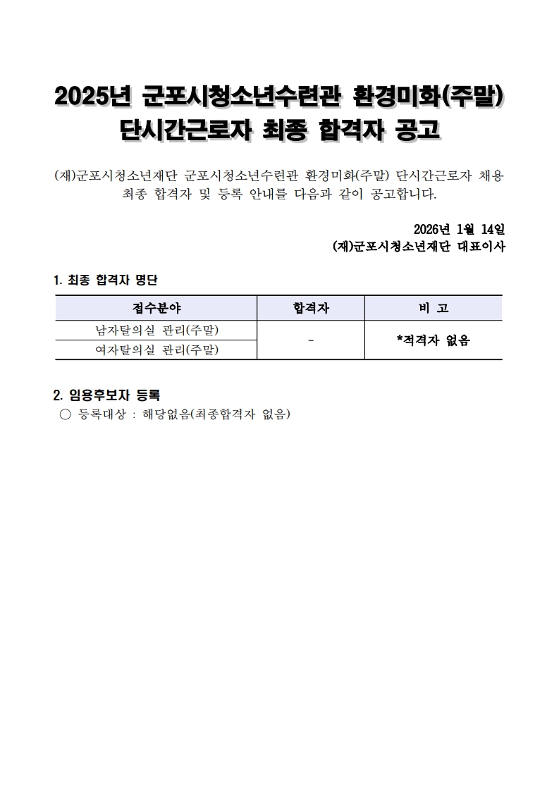 군포시청소년수련관 환경미화(주말) 단시간근로자 재공고 최종합격자 공고